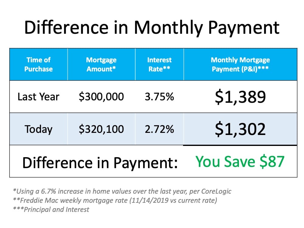 Compared to this time last year, you’ll actually save $87 dollars a month by purchasing that home today, which equates to over one thousand dollars a year.