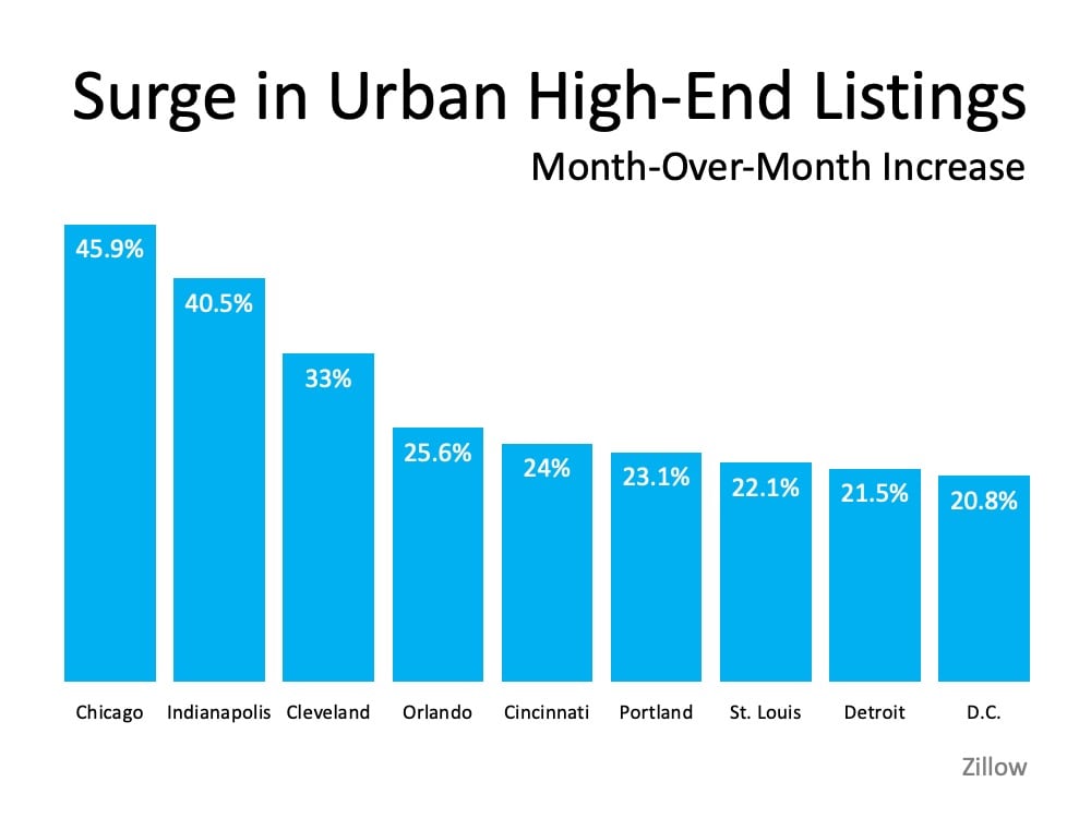According to recent data from Zillow, there is a current surge in urban high-end listings in some larger metro areas. The month-over-month increase in these homes going on the market indicates more urban homeowners may be ready to make a move out of the city, particularly at the upper end of the market (See graph below):